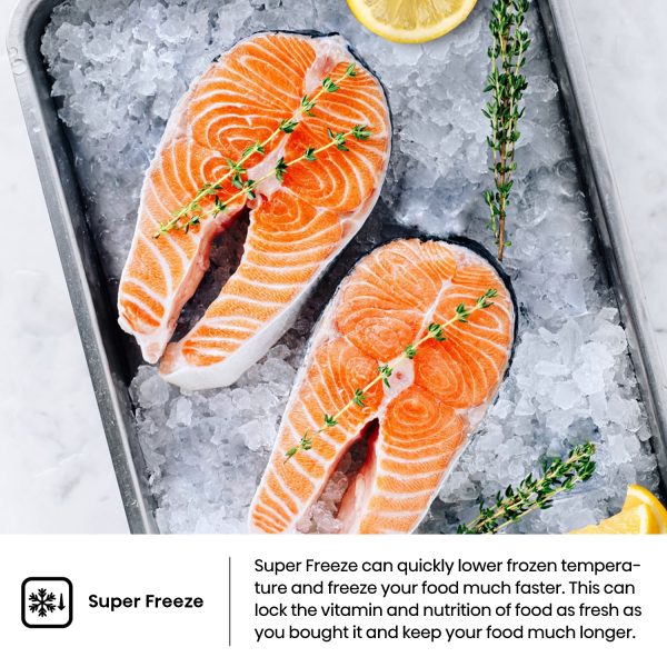 With the touch of button, the “super cool function” will assure quick cooling of your fresh food – this feature is especially helpful after a trip to the grocery store to help cool items quickly. When it’s time to stock your freezer with new food, use the “super freeze function”, which will rapidly lower the temperature and generate cold air to freeze your groceries quickly, and keeping them in optimum condition.