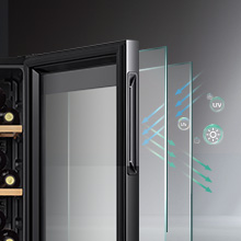 The tempered glass door helps to protect the wine from harmful UV rays. The wine can be stored in the dark to prevent the light and heat from affecting the quality of the wine.
